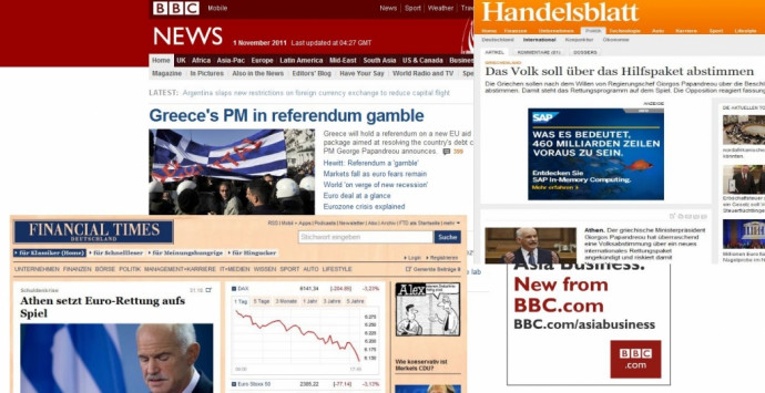 Η πρώτη ανάγνωση των εξαγγελιών του πρωθυπουργού από τον ευρωπαϊκό Τύπο είναι πως το πακέτο διάσωσης της Ελλάδας όπως αποφασίστηκε στη Σύνοδο Κορυφής τίθεται πλέον εν αμφιβόλω. Και σε κάθε περίπτωση όλες οι ευρωπαϊκές κυβερνήσεις έχουν στρέψει τα μάτια τους και πάλι στην Ελλάδα, ενώ όλα τα Μέσα Ενημέρωσης της ηπείρου παρακολουθούν «μουδιασμένα» τις ραγδαίες εξελίξεις.